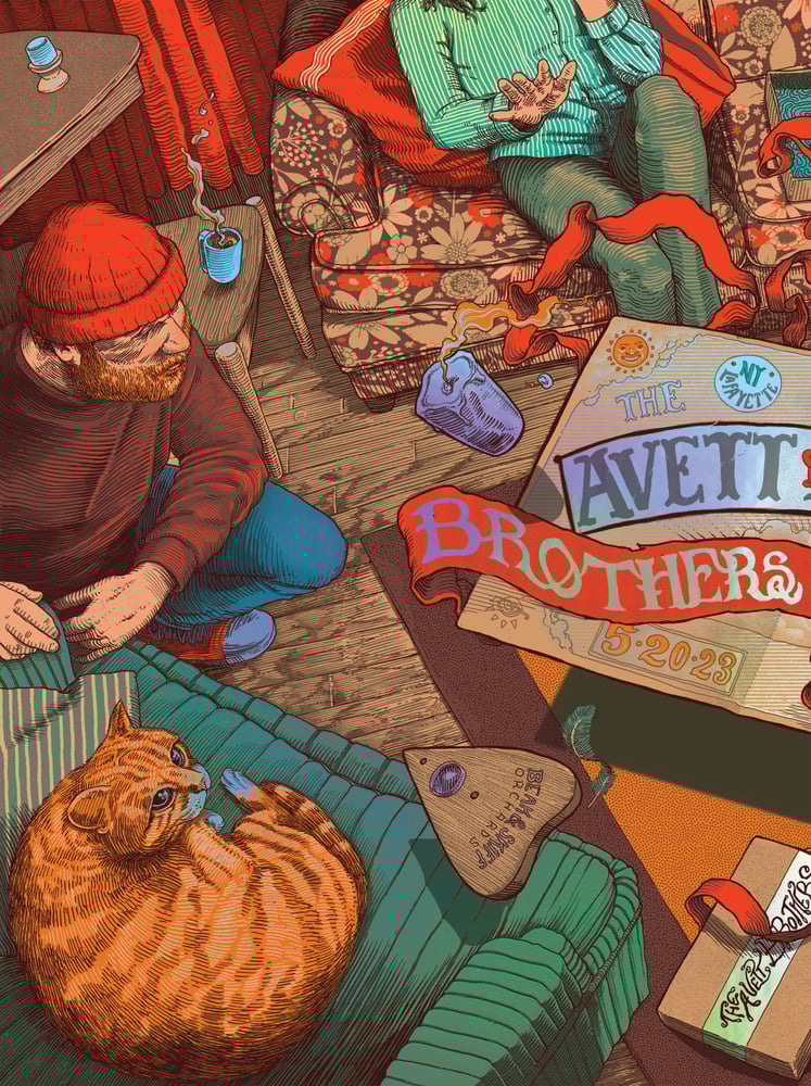 This is one half of the double (diptych) print I did for the band Avett Brothers and their two shows in Lafayette, NY May 19th and 20th, 2023. I drew this and my good friend Paul Kreizenbeck colored it!