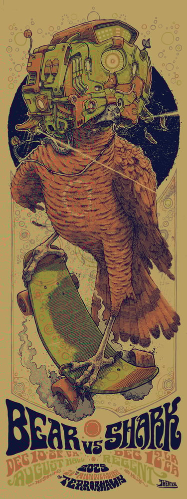 This is the poster I was able to make for the legendary Michigan band BEAR VS SHARK and their two west coast tour dates in December of 2025.
