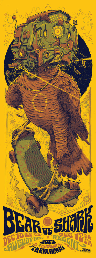 This is the poster I was able to make for the legendary Michigan band BEAR VS SHARK and their two west coast tour dates in December of 2025.