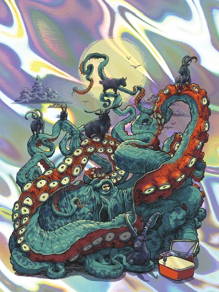 This is an art print! No band name! Just an industrious octopus holding his mountain goat friends high up to the heavens while also providing cold beverages for all in attendance.