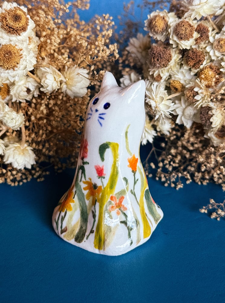 This is a hand made porcelain Kitten Ghost standing spookily at around 4" and hand painted with tall grass, pumpkins and coated with first clear glaze.